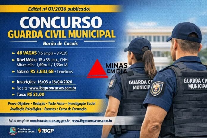 A Prefeitura de Barão de Cocais publicou em janeiro, o Edital nº 01/2026 do concurso público para provimento de cargos efetivos da Guarda Civil Municipal (GCM). O certame prevê o preenchimento de 48 vagas, sendo 45 para ampla concorrência e três reservadas a pessoas com deficiência, além da formação de cadastro de reserva.