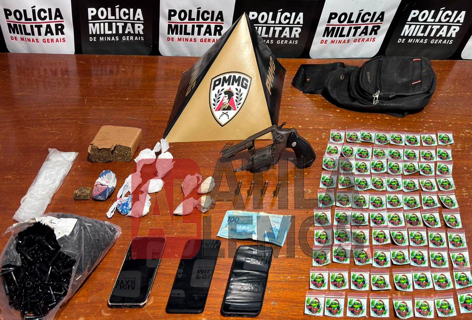 Com o grupo, os militares apreenderam três aparelhos celulares, uma arma de fogo de fabricação artesanal, um revólver calibre .38, quatro munições do mesmo calibre, além de R$ 310 em dinheiro. Também foram recolhidos materiais relacionados ao tráfico, como eppendorfs vazios, sacos plásticos e embalagens utilizadas para acondicionamento de drogas.