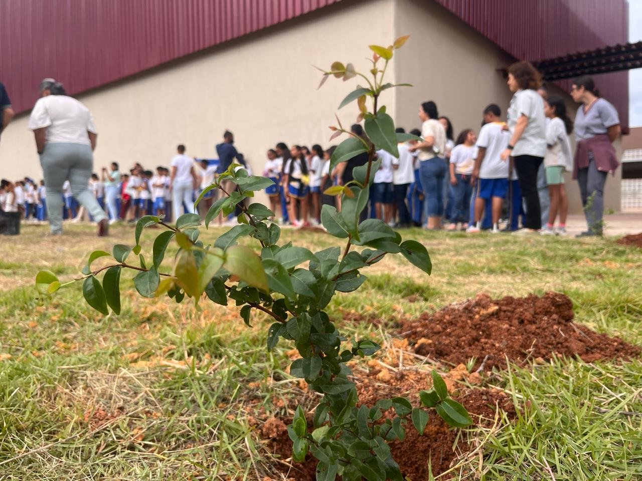 Cerca de 70 mudas de acerola, fornecidas pelo Viveiro Municipal, foram plantadas no jardim da nova escola integral da comunidade, que está em fase final de obras. O local foi denominado “Bosque do Amanhã” e visa melhorar o clima local e promover práticas sustentáveis entre crianças.