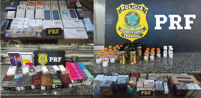 Também foram registradas apreensões de mercadorias importadas, sem o devido desembaraço aduaneiro, com destaque para equipamentos eletrônicos, de informática (smarphones e macbooks da marca Apple), carregadores e perfumes. Uma carreta do tipo baú, completamente carregada com roupas de procedência estrangeira, sem documentação, também foi apreendida.