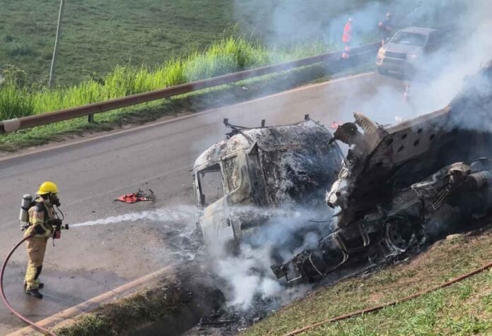Uma carreta que transportava produtos diversos, como cremes e eletrodomésticos, foi completamente destruída por um incêndio na manhã desta quarta-feira (8), na BR-381, no trevo de Barão de Cocais, em São Gonçalo do Rio Abaixo (MG).